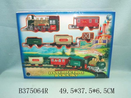 В наборе: локомотив, 4 вагона в коробке и железнодорожное полотно.