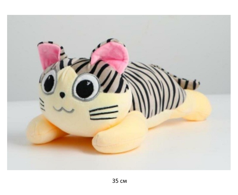 Мягкая игрушка в виде полосатой кошечки, которая лежит выглядит мило и станет надежным другом для ребенка. Игрушка очень приятная на ощупь благодаря мягкому материалу, из которого сшита. Её легко стирать и сушить.