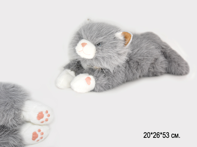 им Кошка арт. 209403 Серая белые лапки и мордочка лежит мяукает 60 см в пак.