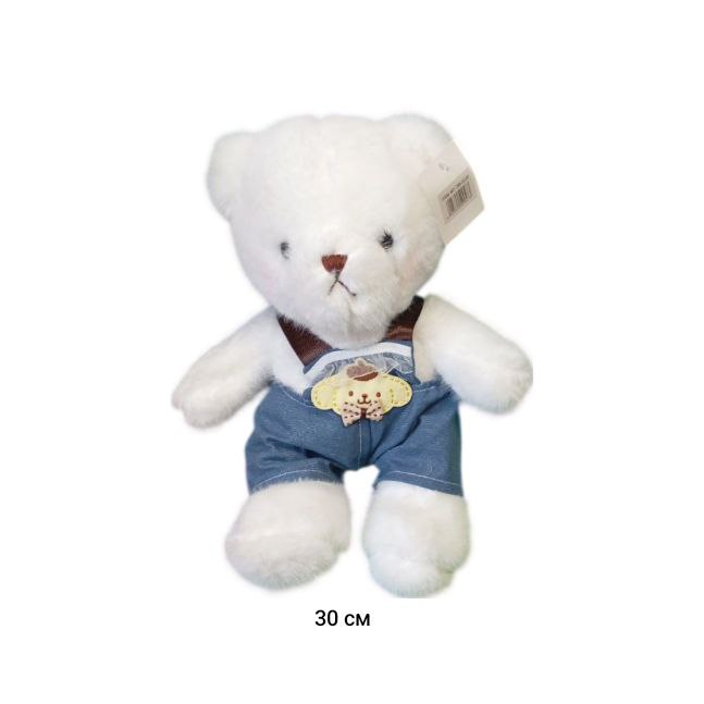 им Медведь арт. 789-133-30 Белый в джинсковом комбимнезоне 30 см в пак._