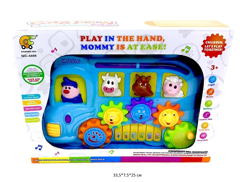 Детское развивающее пианино способствует развитию музыкального слуха и чувства ритма малыша. Прианино вопроизводит различные мелодии, звуки животных, а так же светится во время игры. Колеса автобуса выполнены в виде шестеренок, которые можно крутить развивая мелкую моторику рук.