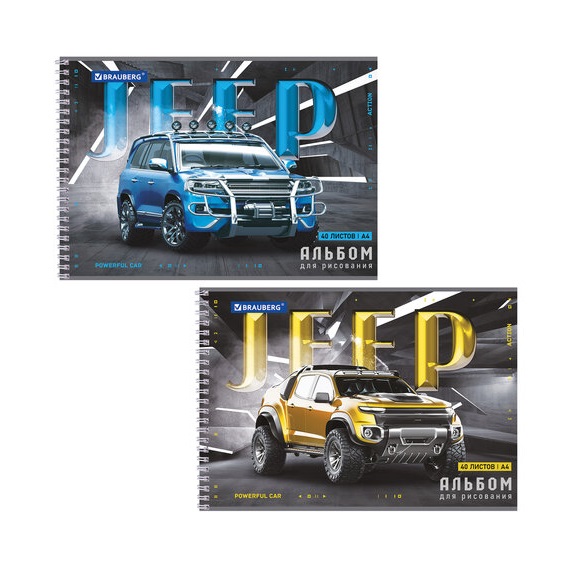 кс_Альбом для рисования арт. 106709 А4, 40 л. гребень,облож. картон BRAUBERG 195х285мм "Джипы" 2видаСодержит 40 листов плотностью 100 г/м2 формата А4 (195х285 мм). Красочная обложка выполнена из мелованного картона. Скрепление листов осуществляется с помощью евроспирали. Подходит для смешанных техник рисования: красками, карандашами и фломастерами. Поставляется в нескольких вариантах дизайна (без возможности выбора).