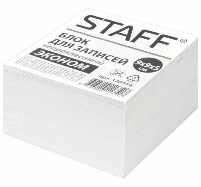 кс_Блок для записей арт. 126574 STAFF, непроклеенный, куб 9х9х5см,белизна 70-80%Блок высотой 5 см сложен из квадратных листов размером 9х9 см. Листы изготовлены из высококачественной офсетной бумаги плотностью 55 г/м2 и белизной 70-80%.