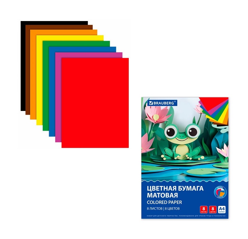 кс_Цветная бумага арт. 116624 А4 офсетная 8 л. 8 цв. на скобе BRAUBERG 200х283мм "Лягушонок"Набор офсетной односторонней цветной бумаги плотностью 65 г/м2 включает 8 листов формата А4 (200х283 мм) в 8 разнообразных и насыщенных однородных цветах. Листы скреплены скобами, легко режутся и сгибаются.