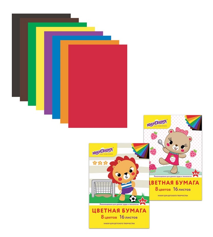 кс_Цветная бумага арт. 129557 А4 офсетная 16 л. 8 цв. на скобе ЮНЛАНДИЯ 200х280мм АССОРТИТип бумаги: матовая, односторонняя