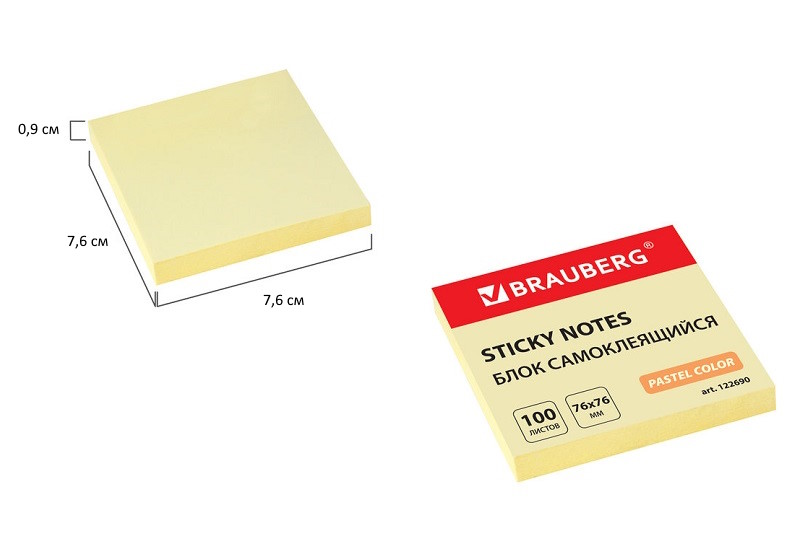 кс_Блок самоклеящийся арт. 122690 (стикеры) BRAUBERG ПАСТЕЛЬНЫЙ 76х76 мм, 100 л. желтыйЧтобы стикеры держались дольше, следуйте рекомендациям по использованию: 1. Отделяйте листы от блока вдоль клеевой полосы, в горизонтальном направлении. Это поможет избежать скручивания и последующего отклеивания стикера. 2. Убедитесь в отсутствии пыли и грязи на поверхности для приклеивания. Так вы обеспечите наиболее продолжительный срок службы клеевого слоя.