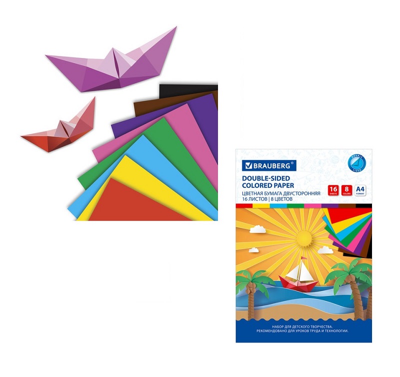 кс_Цветная бумага арт. 129925 А4 2-сторонняя офсет. 16л. 8цв. на скобе BRAUBERG 200х275мм "Кораблик"Набор офсетной двусторонней цветной бумаги плотностью 65 г/м2 включает 16 листов формата А4 (200х275 мм) в 8-ми разнообразных и насыщенных однородных цветах. Листы скреплены скобами, легко режутся и сгибаются.