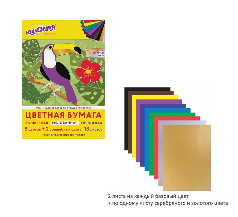 кс_Цветная бумага арт. 113535 А4 мелованная ВОЛШЕБНАЯ 18л. 10цв. на скобе Юнландия 200х280мм ТуканТип бумаги: глянцевая, односторонняя
