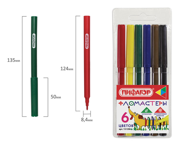 кс_Фломастеры арт. 151396 ПИФАГОР "Веселая такса", 6 цветов, вентилируемый колпачок