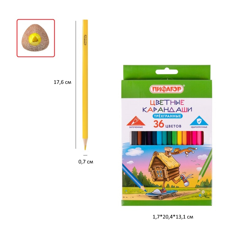 - кс_Карандаши цветные арт. 181824 ПИФАГОР "Сказки", 36 цветов, трехгранные, натуральное дерево×кс_Карандаши цветные арт. 181824 ПИФАГОР "Сказки", 36 цветов, трехгранные, натуральное деревоЦветные карандаши "Сказки" предназначены для детского творчества. Набор состоит из 36 цветов: темно-синий, синий, фиолетовый, сиреневый, пурпурный, коралловый, розовый, бежевый, бледно-розовый, бордовый, красный, алый, темно-оранжевый, канареечный, оранжевый, желтый, бледно-желтый, белый, серебристый, золотистый, черный, серый, темно-зеленый, болотный, зеленый, бирюзовый, салатовый, бледно-зеленый, светло-серый, темно-коричневый, коричневый, каштановый, светло-коричневый, песочный, голубой, синий. Трехгранная форма сечения корпуса позволяет не скатываться карандашу с поверхности стола во время занятий рисованием. Они изготовлены из высокосортной белой древесины ценных пород и имеют лакированный корпус. Легко затачиваются. Грифель из натуральных материалов и пигментов диаметром 2,6 мм обладает повышенной прочностью. Все карандаши заточены и поставляются картонной упаковке с европодвесом.