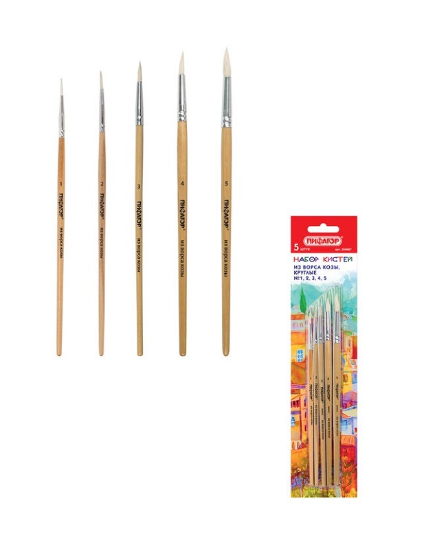 - кс_Кисти арт. 200887 ПИФАГОР, набор 5 шт. (КОЗА: круглые № 1, 2, 3, 4, 5), блистер с европодвесом×кс_Кисти арт. 200887 ПИФАГОР, набор 5 шт. (КОЗА: круглые № 1, 2, 3, 4, 5), блистер с европодвесомНабор кистей различного размера позволяет начинающим художникам решать любые творческие задачи в детском саду, школе и дома. Кисти имеют разную жесткость. Кисти из ворса козы отлично впитывают и отдают краску, хорошо держат форму, долговечны и надежны. Благодаря кистям №1, 2, 3 ребенку будет комфортно прорисовывать мелкие детали. Кисти №4 и 5 позволят делать более крупные мазки и линии. Деревянную лакированную рукоятку кисти удобно держать в руке.
