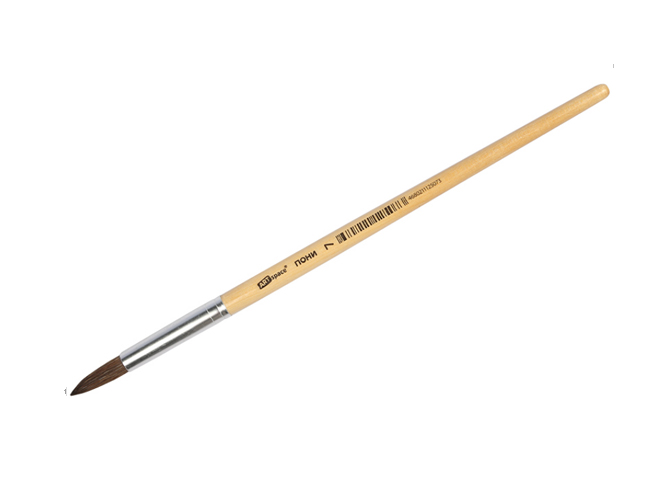 - Кисть художественная круглая Пони №07 "Art Space", арт.РH7_14507 (1/10) РH7_14507×Кисть художественная круглая Пони №07 "Art Space", арт.РH7_14507 (1/10) РH7_14507Художественные кисти ArtSpace изготовлены из волоса пони. Он несколько толще, чем у белки, расстояние между волосками больше, поэтому воду такая кисточка набирает меньше, чем из белки или колонка. Приобретают форму конуса, не слишком упруги. Кисть круглой формы с короткой ручкой из дерева идеальна для начинающих художников, поэтому её часто используют в детских образовательных учреждениях.