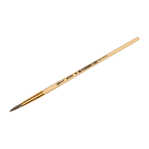 Круглая кисть №04 позволяет создавать на белом листе удивительные картины и образы. Изделие имеет длинную деревянную ручку и металлическую обойму.
