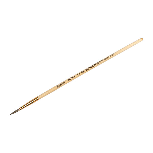 Круглая кисть №02 позволяет создавать на белом листе удивительные картины и образы. Она выполнена из волоса белки. Изделие имеет длинную деревянную ручку и металлическую обойму.