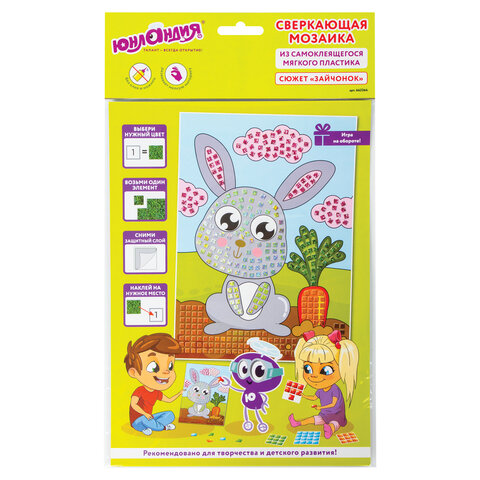 - Набор для творчества "Сверкающая мозаика из мягкого пластика", "Зайчонок", 21х29 см, ЮНЛАНДИЯ, 66236ID: СА_662364×Набор для творчества "Сверкающая мозаика из мягкого пластика", "Зайчонок", 21х29 см, ЮНЛАНДИЯ, 66236Сверкающая мозаика из мягкого пластика EVA ЮНЛАНДИЯ "Зайчонок" - это весёлый и занимательный способ развития мелкой моторики, аккуратности и цветового восприятия ребёнка. Все элементы в составе самоклеящиеся, для работы не требуются ножницы и клей.151.58 руб.