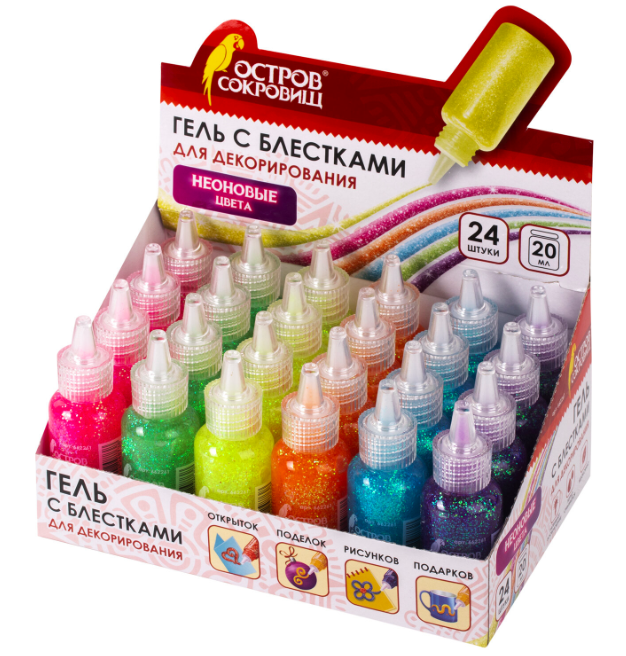45.59 руб. - кс_Гель с блестками арт. 662261 ОСТРОВ СОКРОВИЩ, 20 мл, неон, цв. ассорти, в дисплее×кс_Гель с блестками арт. 662261 ОСТРОВ СОКРОВИЩ, 20 мл, неон, цв. ассорти, в дисплееГель с блёстками для творчества и декорирования поделок из бумаги, картона, дерева, пластика и других материалов. Удобный наконечник с дозатором позволяет легко наносить гель на любую поверхность.
