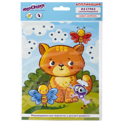 Аппликация из страз ЮНЛАНДИЯ "Котёнок" - это весёлый и занимательный способ развития мелкой моторики, аккуратности, цветового восприятия и фантазии ребёнка. Все элементы в составе самоклеящиеся, для работы не требуются ножницы и клей.