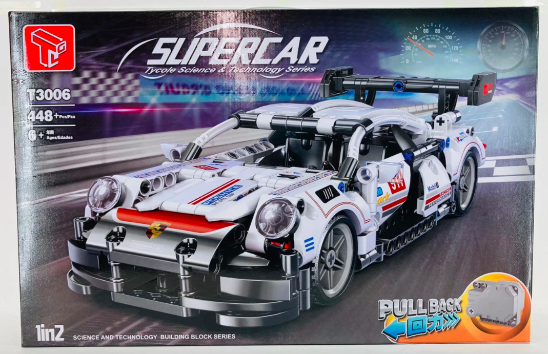 Конструктор «Спортивный автомобиль Porsche 911» с инерционным механизмом, открывающимися дверями и капотом. В наборе 448 деталей из которых ребенок соберет точную копию гоночного автомобиля. Модель окрашена в белый цвет с черными вставками и наклейками по всему корпусу. В набор входит пошаговая иллюстрированная инструкция, благодаря которой ребенок наглядно увидит из каких деталей собирается каждый шаг.