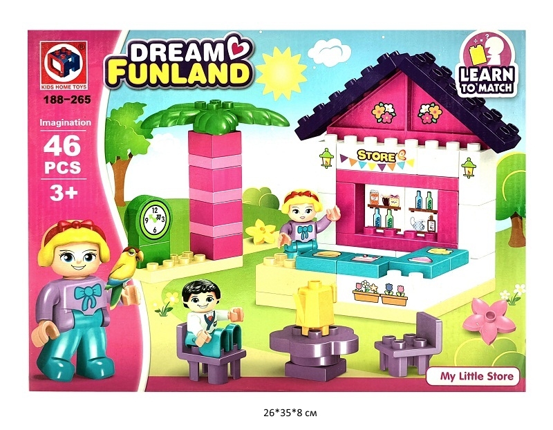 Конструктор арт. 188-265 "Страна мечты" 46 дет. в кор._Набор состоит из крупных деталей, которые позволяют построить торговый прилавок и небольшое кафе, где можно отдохнуть в тени пальмы.