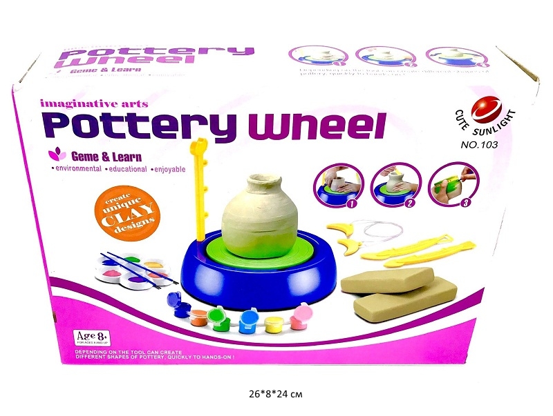С набором "Юный гончар" ребенок познает все тайны гончарного ремесла и своими руками сможет изготовить глиняные изделия. Пользоваться гончарным кругом очень просто: сначала необходимо вставить батарейки, затем замесить глину до состояния мягкости, готовую глину поместить в центр круга, аккуратно надавливая и смещая ее в разные стороны. Форма изделия будет зависеть от положения рук юного гончара. Когда работа высохнет, ее можно будет раскрасить яркими красками. В комплекте есть все необходимое, чтобы своими руками создать уникальное глиняное произведение.