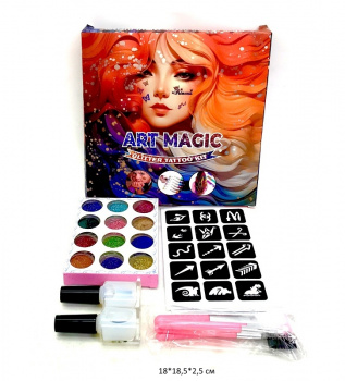В наборе: трафареты 15 шт, блёстки 12 оттенков, клей 2 бутылька, набор кисточек для нанесения тату
