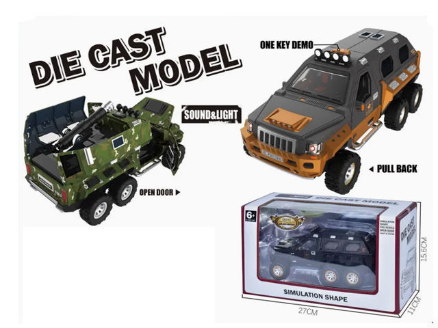 Модель металл. арт. 24016P Джип цвета микс свет, пар (8 шт.) шоубокс•У модели открываются все двери, капот и багажник, детально проработанный салон, световые и звуковые эффекты, а так же функция пуская пара. Игрушка с инерционным механизмом: оттяните ее назад и отпустите - машинка умчится вперед, набирая скорость.