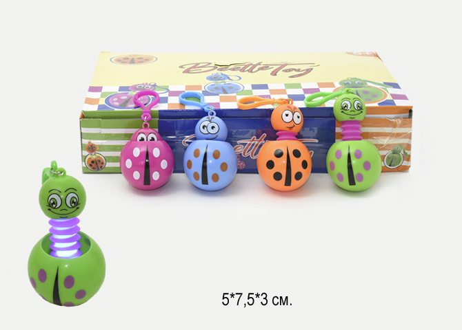 Брелок арт. 260102 Божья коровка на карабине свет в пак. /24 шт./ в шоубоксе+В собранном состоянии голова коровки почти полностью спрятана в тельце, но ее можно вытащить и тогда длинная шея будет ярко светиться и мигать.